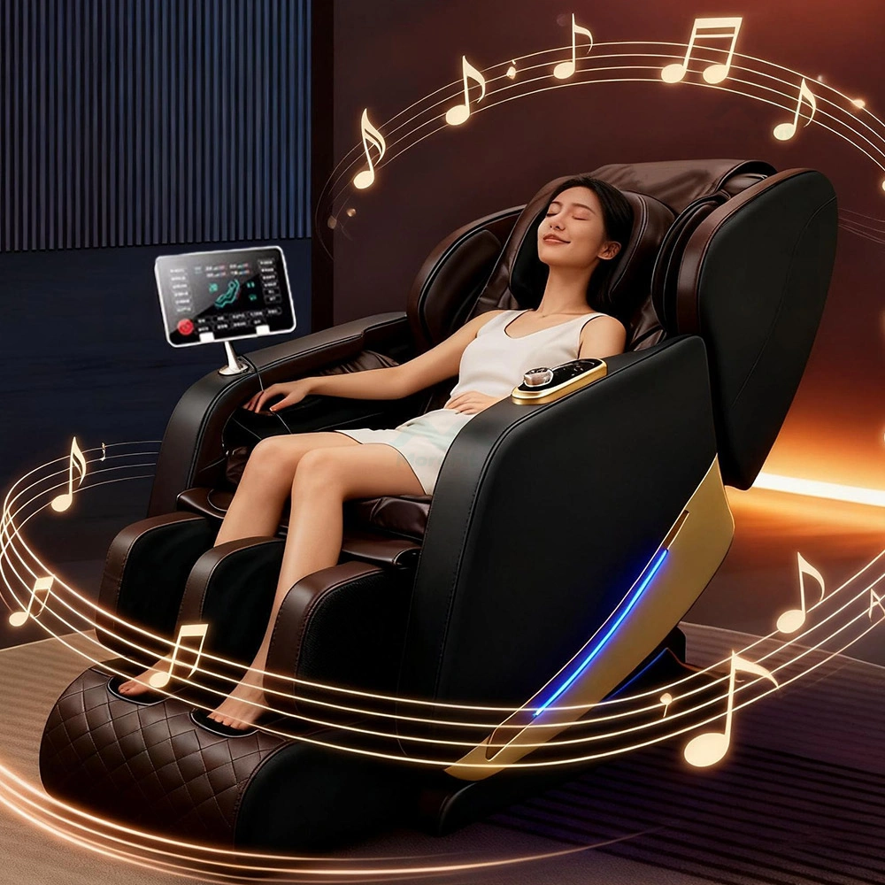 This luxury massage chair combines sophisticated aesthetics with powerful functional performance: precise roller kneading and shiatsu target key pressure points on the neck, shoulders, back, hips, and soles for optimal relief. It boasts luxurious full-body wave airbags with varied dynamic modes and intensity levels, plus gentle back and calf heating to deepen relaxation and calm the mind. Features a supportive zero-gravity space capsule, high-fidelity Bluetooth music, optional AI voice control, a large intuitive LCD screen, and responsive quick-access buttons for seamless use.